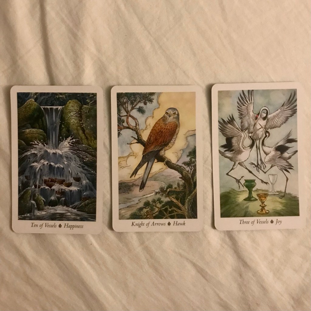 Three cards pulled from the Wildwood Tarot Deck using the Full Moon Spread above.