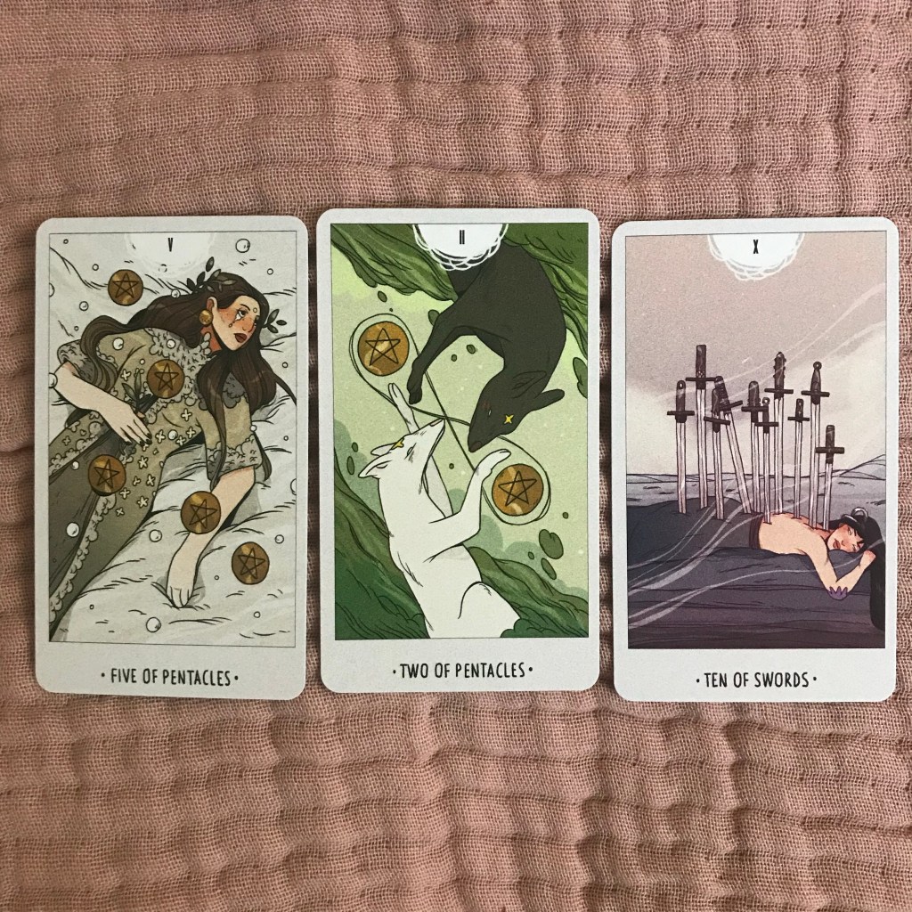 Five of Pentacles, Two of Pentacles and Ten of Swords from the White Numen Deck