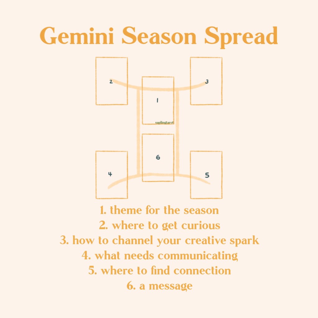 Gemini Season Tarot Spread by SaplingTarot: Six card spread, 1 - theme for the season, 2 - where to get curious, 3 - how to channel your creative spark, 4 - what needs communicating, 5 - where to find connection, 6 - a message.