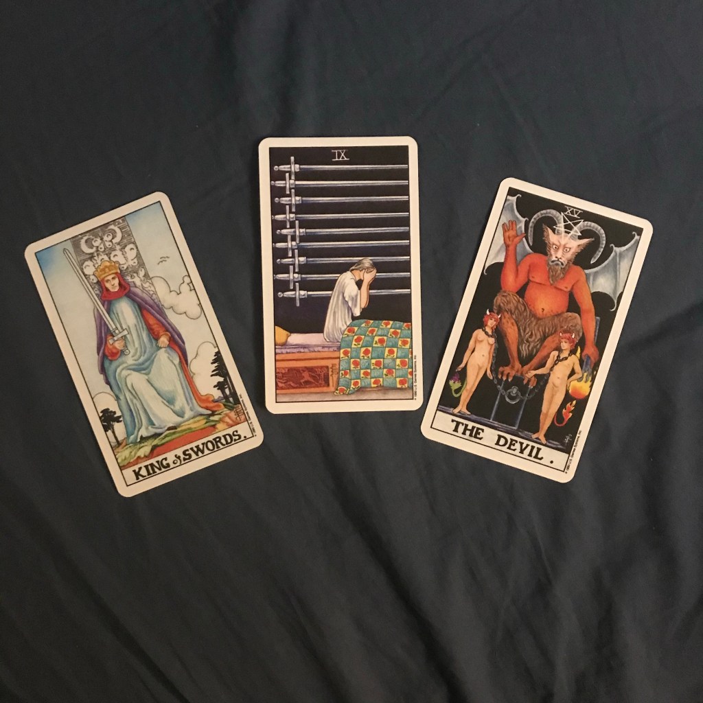 King of Swords, Nine of Swords and The Devil – Universal Waite