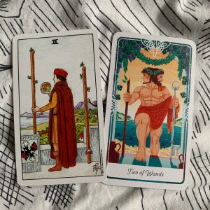 I think the Two of Wands might be my favourite? Although the Queen of Wands is also a card that pops up for me whenever I need her. The Two of Wands suggests options, paths we can take if we have the courage to make the first step. The card in the Tarot of the Divine shows the Roman god Janus, the god of beginnings and journeys (amongst other things). Janus is a god of transitions and to me that makes him a god of liminal spaces which are very important in my practice.