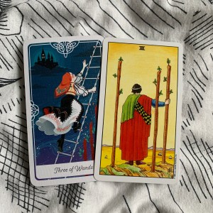 To me, the Three of Wands bursting with potential, it feels like the start of a journey, a journey for which you are totally prepared. The figures in the Three of Wands stands with so much purpose, they know what they want and how they’re going to get there – that’s what I could do with right now.