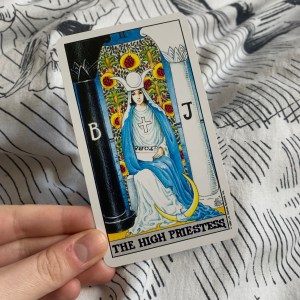 The card I’ve drawn is The High Priestess, card two in the Major Arcana. In the centre of the card sits the priestess, she has pale skin and dark hair beneath her white and blue robes. Her crown is pearly white and features a central orb reminiscent of a full moon. In her hands is a scroll and by her feet is a large crescent moon resting in the folds of her robes. The priestess sits on a stone slab between two pillars, one dark and one light, between them is a tapestry decorated with trees, leaves and pomegranates. Behind the tapestry is a still and peaceful sea.