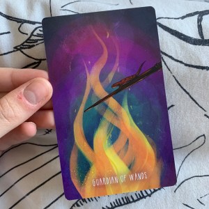 Recently I took a difficult trip to an event that caused me a lot of stress, before I left I pulled the Guardian (Queen) of Wands from the Spacious Tarot, it was exactly the card I needed in that moment and was my phone background for the trip. It felt like a gentler version of diamonds being made under great pressure, seeing the salamander surviving and thriving in amongst the beautiful rainbow flames, this card has become very important to me since then.